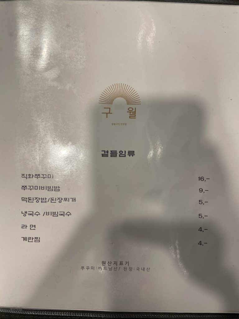 구이 메뉴는 미박삼겹살, 미박목살, 미박항정살, 통갈매기살, 가브리살이있습니다. 된장찌개, 냉국수, 라면등이 있는 곁들임 메뉴도 있습니다.