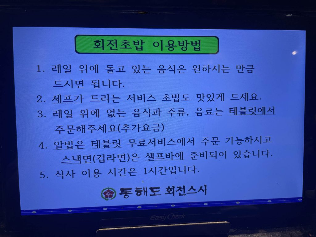 모든 자리에는 이용방법 안내와 음식 주문을 위한 태블릿이 있습니다. 식사 이용 시간은 1시간이며 레일 위에 없는 음식은 태블릿에서 주문할수있습니다.